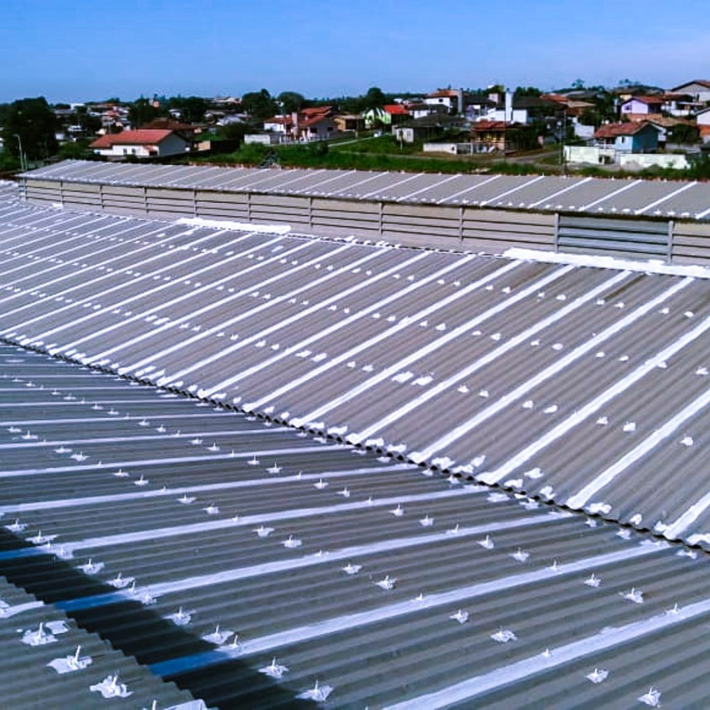 Aplicação de uma manta líquida emborrachada nos pontos de fixação do telhado (parafusos) e sobre a manta adesiva que veda as frestas e pontos de fixação das telhas, a fim de blindar e impermeabilizar os pontos vulneráveis do telhado.